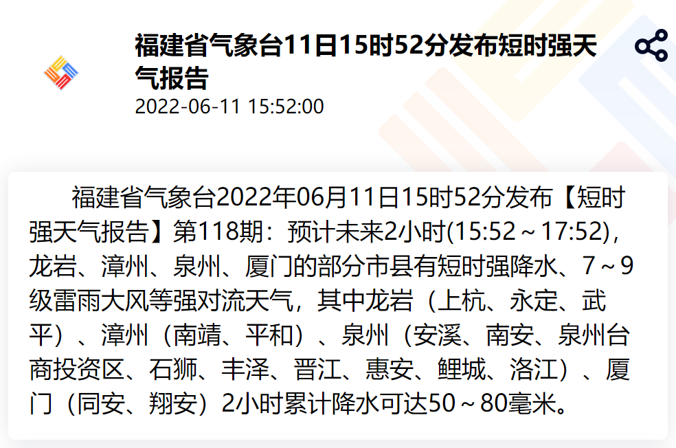 福建省气象台2022年06月11日15时52分发布【短时强天气报告】第118期:预计未来2小时(15:52~17:52),龙岩、漳州、泉州、厦门的部分市县有短时强降水、7~9级雷雨大风等强对流天气,其中龙岩(上杭、永定、武平)、漳州(南靖、平和)、泉州(安溪、南安、泉州台商投资区、石狮、丰泽、晋江、惠安、鲤城、洛江)、厦门(同安、翔安)2小时累计降水可达50~80毫米。
