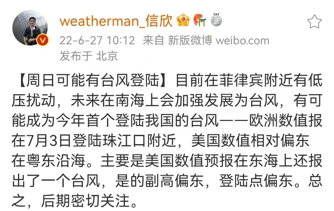 据中央气象台中期预报6月底菲律宾至南海海域将有1个台风生成并可能在7月3日前后北上影响我国华南地区带来明显风雨天气