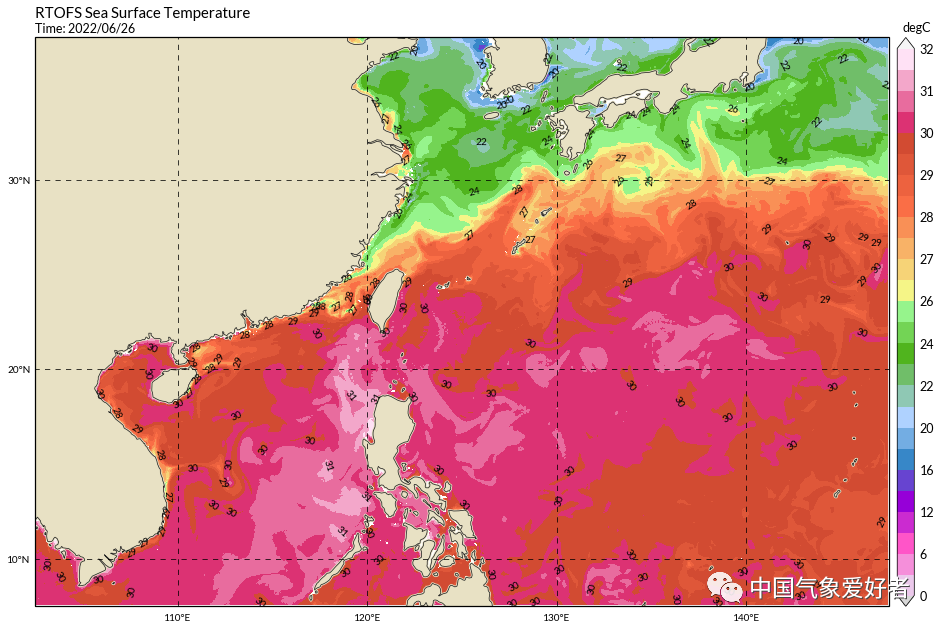 值得警惕的是目前南海北部海温大幅偏高有成片的30度以上海域 台风有近岸突然增强的可能