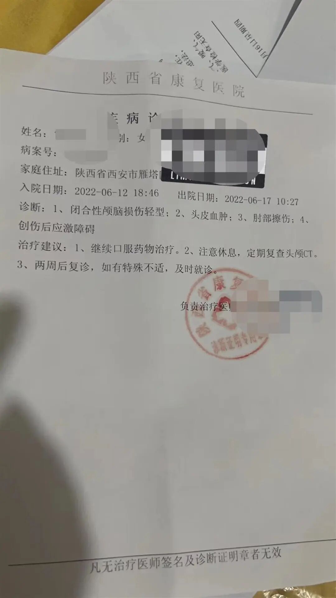 “当天我感觉不舒服,到医院去做了检查。”24日,萱萱给记者发来了一份《疾病诊断证明书》。诊断书上,诊断内容为闭合性颅脑损伤轻型、头皮血肿、肘部擦伤。住院时间从6月12日到6月17日。医生建议其继续口服药物治疗,注意休息,定期复查头颅CT,并及时复诊。