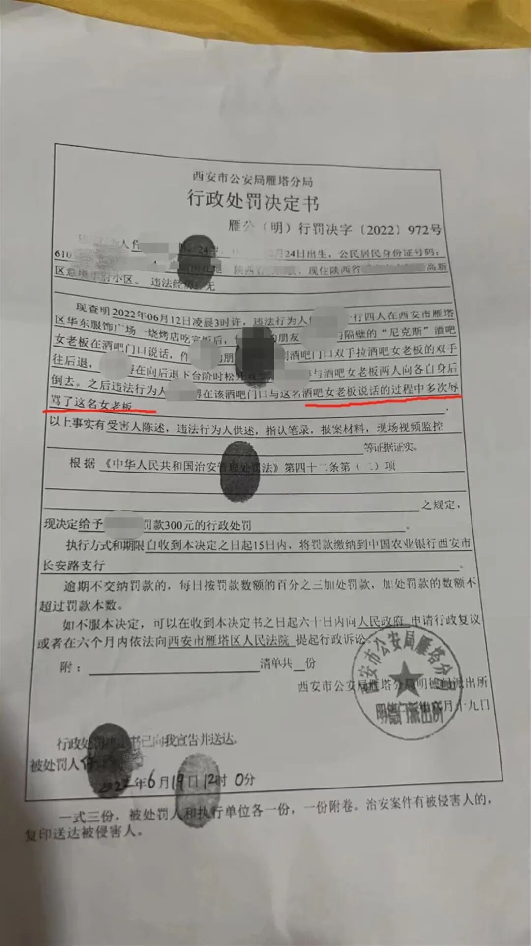 西安一酒吧女老板凌晨遭多人围堵辱骂,一违法人员被行政罚款300元