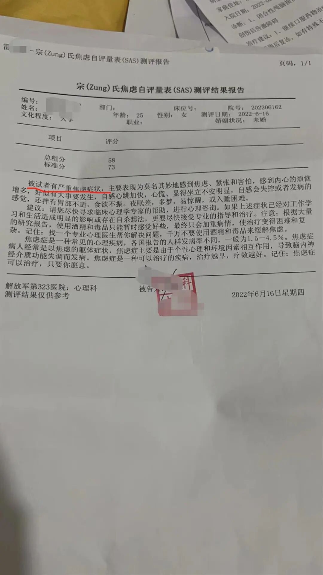 根据萱萱提供的一份宗(Zung)氏焦虑自评量表(SRS)测评报告诊断,医生称她有严重焦虑症状,并建议她尽快寻求临床心理学专家的帮助,进行心理咨询。