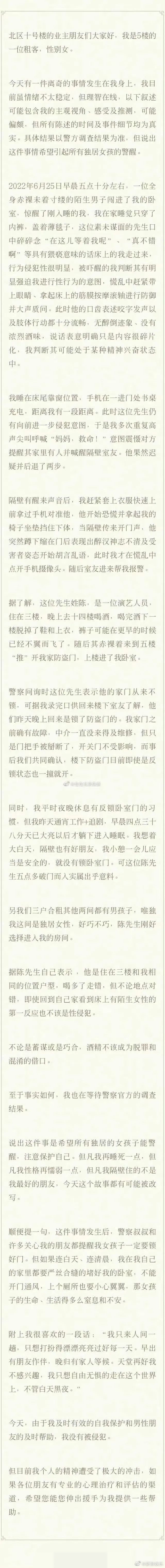 从发帖人的文字中可以看出,陈霄华与受害女子并不相识,他住在3楼,女子住在5楼。24日晚,陈霄华到14楼友人家喝酒,在第二天早上5点多闯入了受害女子家。