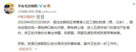 脱光衣服乘电梯上楼进入五层未锁门的某住户卧室内将正在休息的女事主惊醒目前陈某已被朝阳公安分局依法