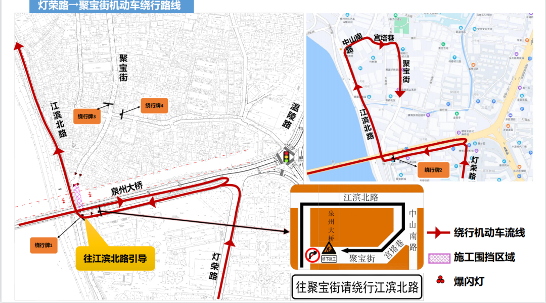 2.灯荣路方向车辆前往聚宝街:由江滨北路辅路—中山南路—宫塔巷—聚宝街;