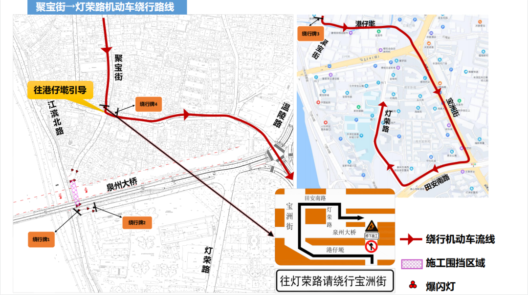 3.聚宝街方向车辆前往灯荣路:由港仔墘—宝洲街—田安南路—灯荣路。