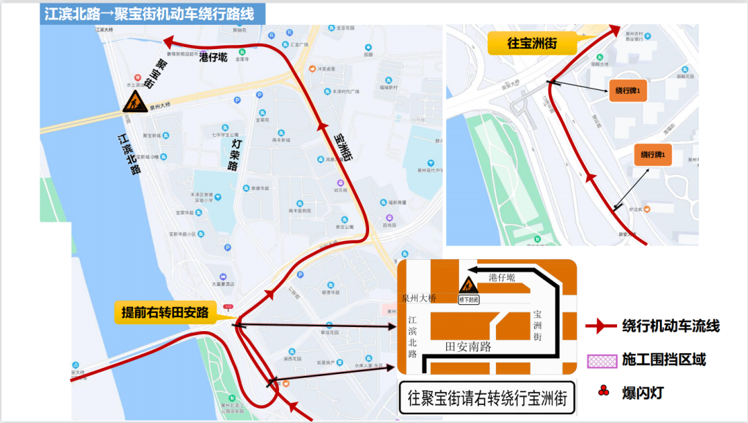 1.江滨北路方向车辆前往聚宝街:由江滨北路—田安南路—宝洲街—港仔墘—聚宝街;
