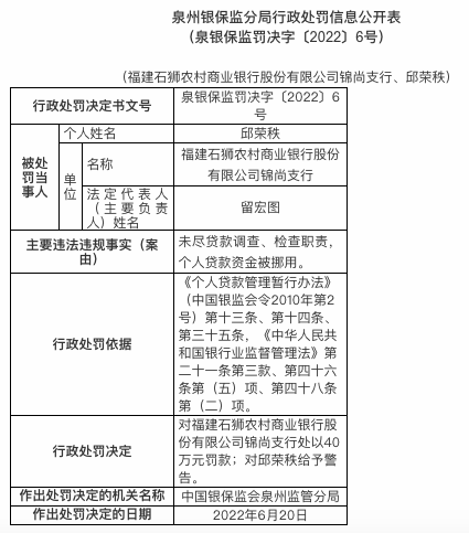 2022年6月20日,中国银保监会泉州监管分局对福建石狮农村商业银行股份有限公司锦尚支行(法定代表人(主要负责人)姓名留宏图)处以40万元罚款;对邱荣秩给予警告。主要违法违规事实(案由)为:未尽贷款调查、检查职责,个人贷款资金被挪用。