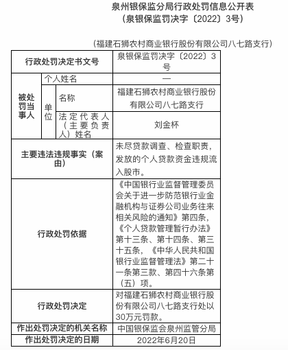 2022年6月20日,中国银保监会泉州监管分局对福建石狮农村商业银行股份有限公司八七路支行(法定代表人(主要负责人)姓名刘金杯)处以30万元罚款。主要违法违规事实(案由)为:未尽贷款调查、检查职责,发放的个人贷款资金违规流入股市。