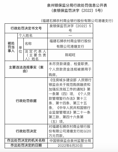 2022年6月20日,中国银保监会泉州监管分局对福建石狮农村商业银行股份有限公司港塘支行(法定代表人(主要负责人)姓名陈昭旺)处以20万元罚款。主要违法违规事实(案由)为:未尽贷款调查、检查职责,个人贷款资金违规被挪用于购房。