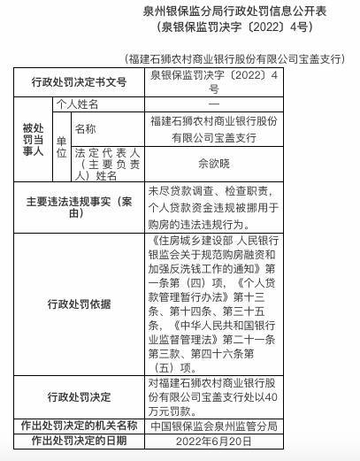 2022年6月20日,中国银保监会泉州监管分局对福建石狮农村商业银行股份有限公司宝盖支行(法定代表人(主要负责人)姓名佘欲晓)处以40万元罚款。主要违法违规事实(案由)为:未尽贷款调查、检查职责,个人贷款资金违规被挪用于购房的违法违规行为。