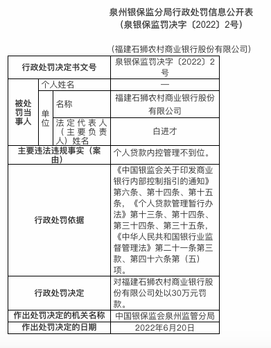 2022年6月20日,中国银保监会泉州监管分局对福建石狮农村商业银行股份有限公司(法定代表人(主要负责人)姓名白进才)处以30万元罚款。主要违法违规事实(案由)为:个人贷款内控管理不到位。