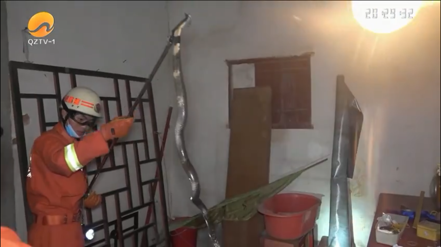 晋江市龙湖消防救援站的消防救援人员赶到现场后,在屋主的指引下,来到房门紧闭的小屋内,很快发现一条长约1.5米的眼镜蛇蜷缩在房间墙角处。消防救援人员先是利用捕蛇器夹住蛇身,将其控制住,随后,另一名消防救援人员用另一把捕蛇器,将蛇头夹住,将其拖出放进事先准备好的袋子内。