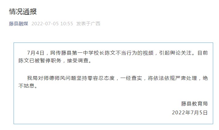 截图据澎湃视频今日(7月5日)上午10:55分,藤县教育局发布情况通报称,7月4日,网传藤县第一中学校长*****不当行为的视频,引起舆论关注。目前*****已被暂停职务,接受调查。