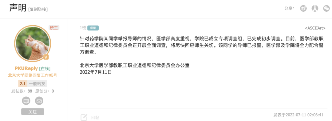 7月11日凌晨,北京大学在论坛北大未名回应网友称多次遭到北京大学医学部教授洪某炼猥亵。