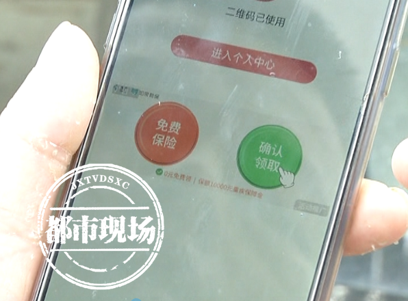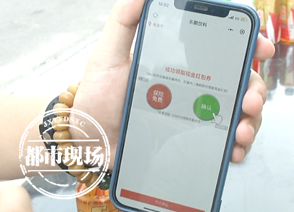 记者决定验证一下,当场扫瓶盖内的二维码,结果显示二维码已经使用。但是在下方却弹出了一个界面,红色圆圈里写着免费保险,绿色圆圈里则写着确认领取。蒋先生说,这个情况和他当初扫码中奖后的页面很相似。