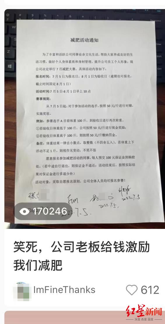 而这份《通知》背后,竟是公司老板一个人减肥太无聊,想拉同事“入伙”。面对老板的挑战,同事们毫不示弱,纷纷表示乐意应战,“10斤起,不能让他失望!”7月11日下午,红星新闻记者找到了这家公司。