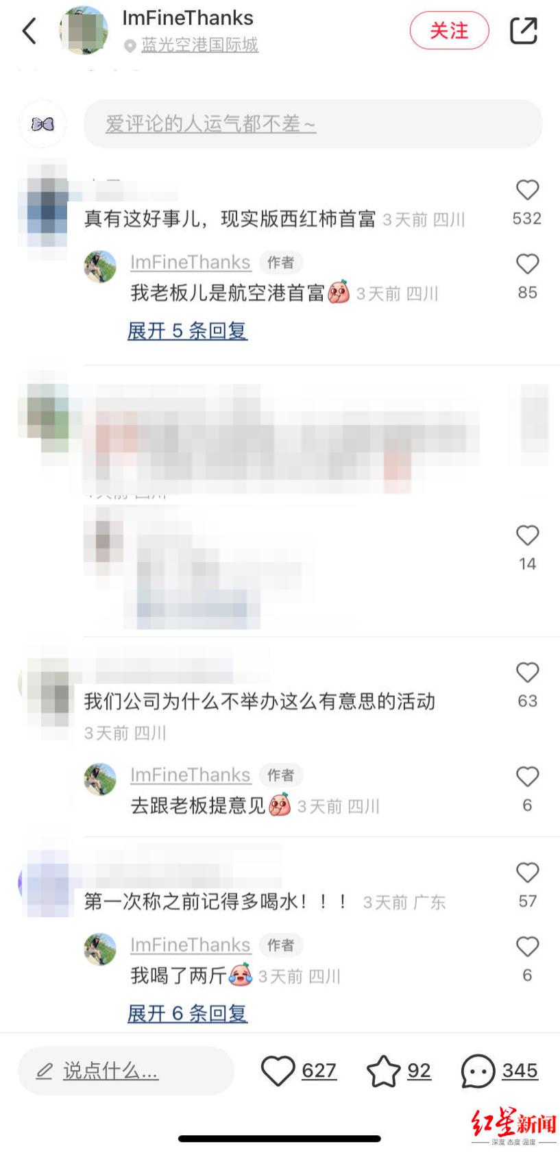 她告诉记者,7月5日老板发布减肥比赛的通知后,她便顺手拍照发在了网上,并配文“笑死,公司老板给钱激励我们减肥,瘦一斤50块,(我)一个月赚500应该可以吧……”帖子发出后并未引起关注,“就只有几个点赞,结果第二天我一看,信息评论99+,我说火了,真的就火了”。