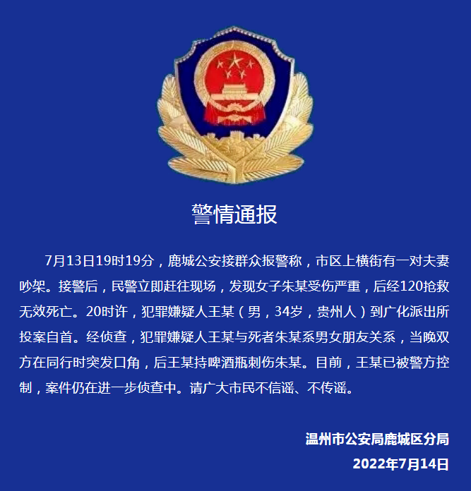 浙江省温州市公安局鹿城区分局7月14日发布警情通报:7月13日19时19分,鹿城公安接群众报警称,市区上横街有一对夫妻吵架。接警后,民警立即赶往现场,发现女子朱某受伤严重,后经120抢救无效死亡。20时许,犯罪嫌疑人王某(男,34岁,贵州人)到广化派出所投案自首。经侦查,犯罪嫌疑人王某与死者朱某系男女朋友关系,当晚双方在同行时突发口角,后王某持啤酒瓶刺伤朱某。目前,王某已被警方控制,案件仍在进一步侦查中。请广大市民不信谣、不传谣。