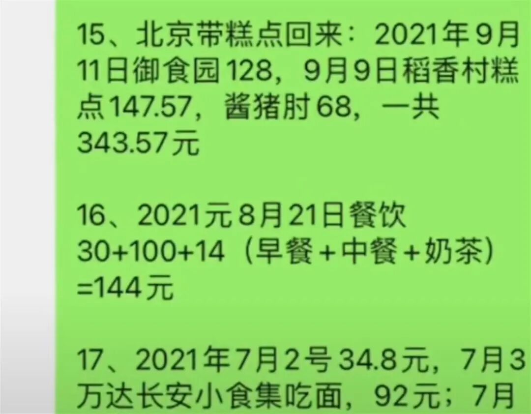 从媒体曝光的视频上看,这份账单里,消费数额直接精确到了小数点后两位,小到一杯奶茶、一顿外卖、10元的停车费都写得清清楚楚,连见家长吃饭的钱都写在其中。女方称,其中很多大额餐饮费都是和男方亲戚一起用餐。