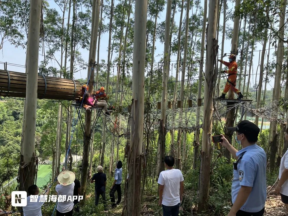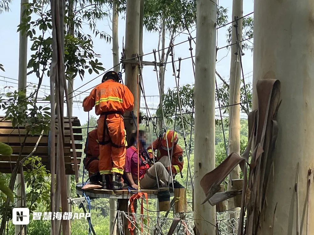 ƽ̨¾àÀëµØÃæÔ¼4Ã׸ߣ¬Çé¿öÊ®·ÖΣÏÕ¡£Îª·ÀֹŮ×Ó²»É÷×¹Â䣬Á½Ãû¾°Çø¹¤×÷ÈËÔ±ÕýÔÚÒ»ÅÔ¶ÔÆäʵʩ¾ÈÖúºÍ¿ØÖÆ¡£