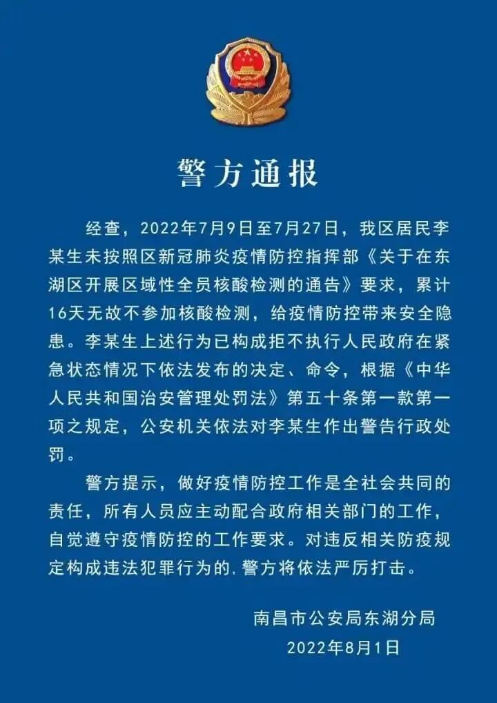 江西省南昌市公安局东湖分局1日在其官方微信发布通报称,经查,2022年7月9日至7月27日,东湖区居民李某生未按照区新冠肺炎疫情防控指挥部《关于在东湖区开展区域性全员核酸检测的通告》要求,
