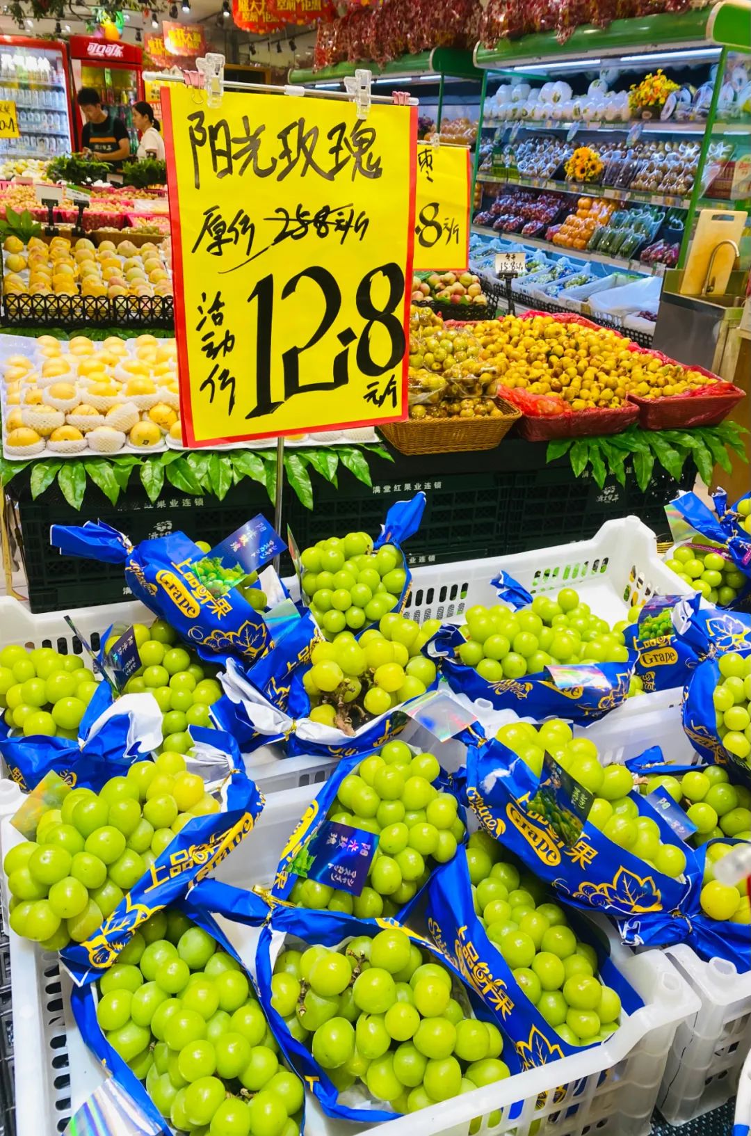 大南门某精品水果店里,阳光玫瑰葡萄为12.8元/斤。超然/摄