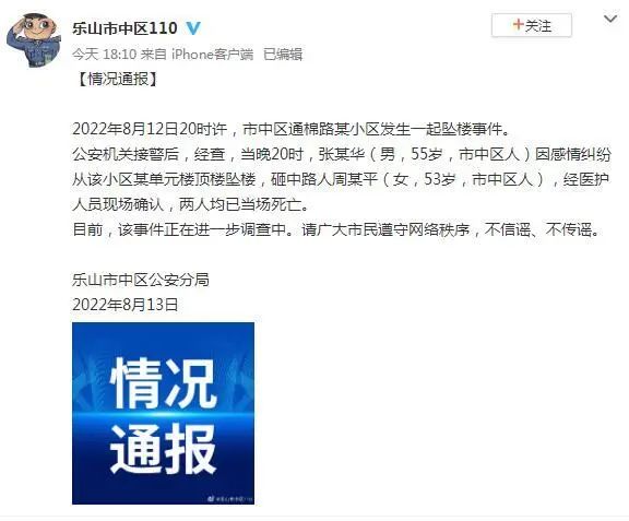 [font=system-ui, -apple-system, system-ui, "]8月13日,@乐山市中区110 通报一起坠楼事件,全文如下:[font=system-ui, -apple-system, system-ui, "]【情况通报】