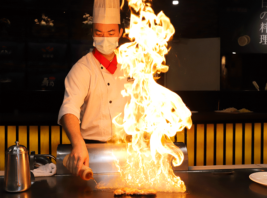 在铁板烧区域可以感受大厨的精彩表演与美食的滋滋香气