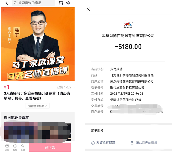 7月初,有人投诉知名电视主持人马丁在直播间介绍一门名为“婚姻情感咨询师”培训的课,培训机构老师介绍,马丁亲自教学,由中国国家人事人才培训网(以下简称:国培网)发证,是就业的重要凭证,5180元的课程学完保证可拿国家认可的准入类资格证书。收款方为“武汉尚德在线教育科技有限公司”。