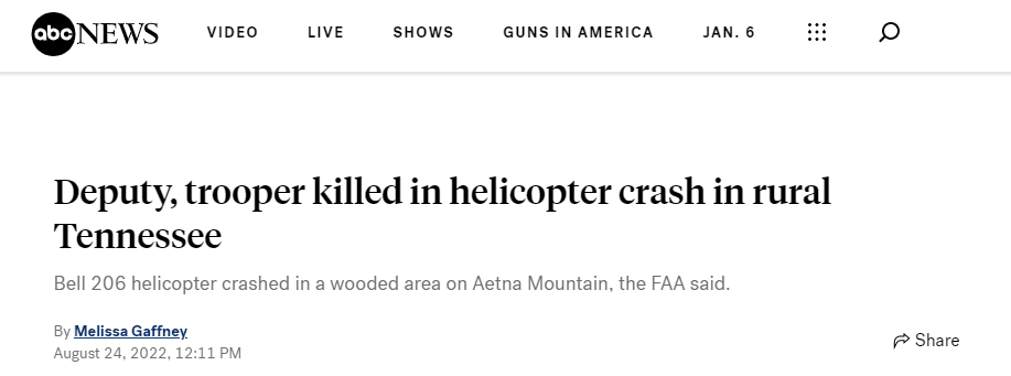 据ABC8月24日报道,当地时间8月23日,一架贝尔-206直升机在美国田纳西州附近坠毁,机上两人全部遇难。