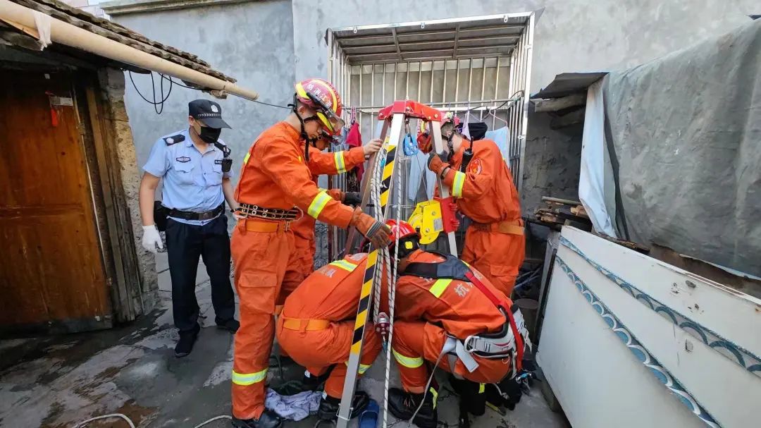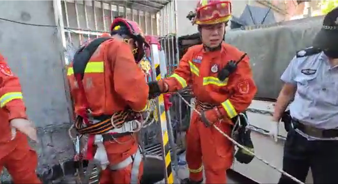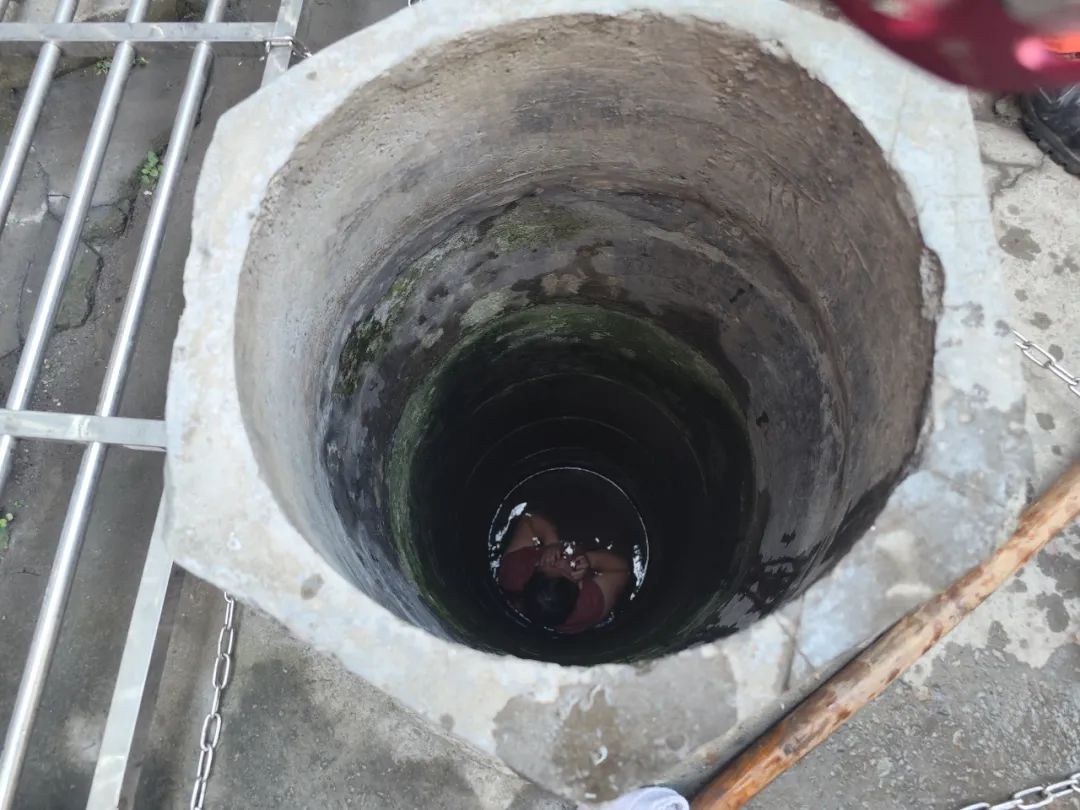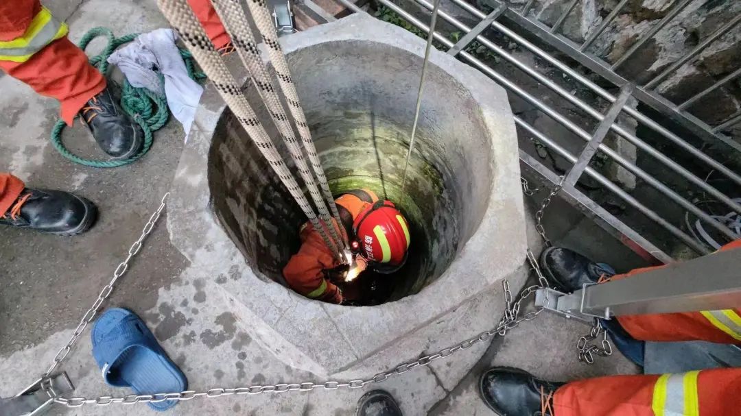了解情况后,现场指挥员立即部署救援方案,考虑到井下含氧量较低,消防救援人员首先使用空气呼吸器向井底供氧,随后在井口上方架设救援三脚架,在井口另一侧利用安全绳进行保护和牵引,防止吊升过程中发生碰伤擦伤等二次意外事故,最后由经验丰富的班长携带保护安全装备深入井中,其余消防救援人员在井边做好保护工作。