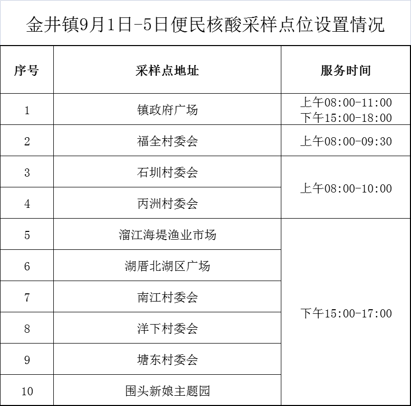 池店镇便民核酸采样点9月1日—15日核酸开放安排如下: