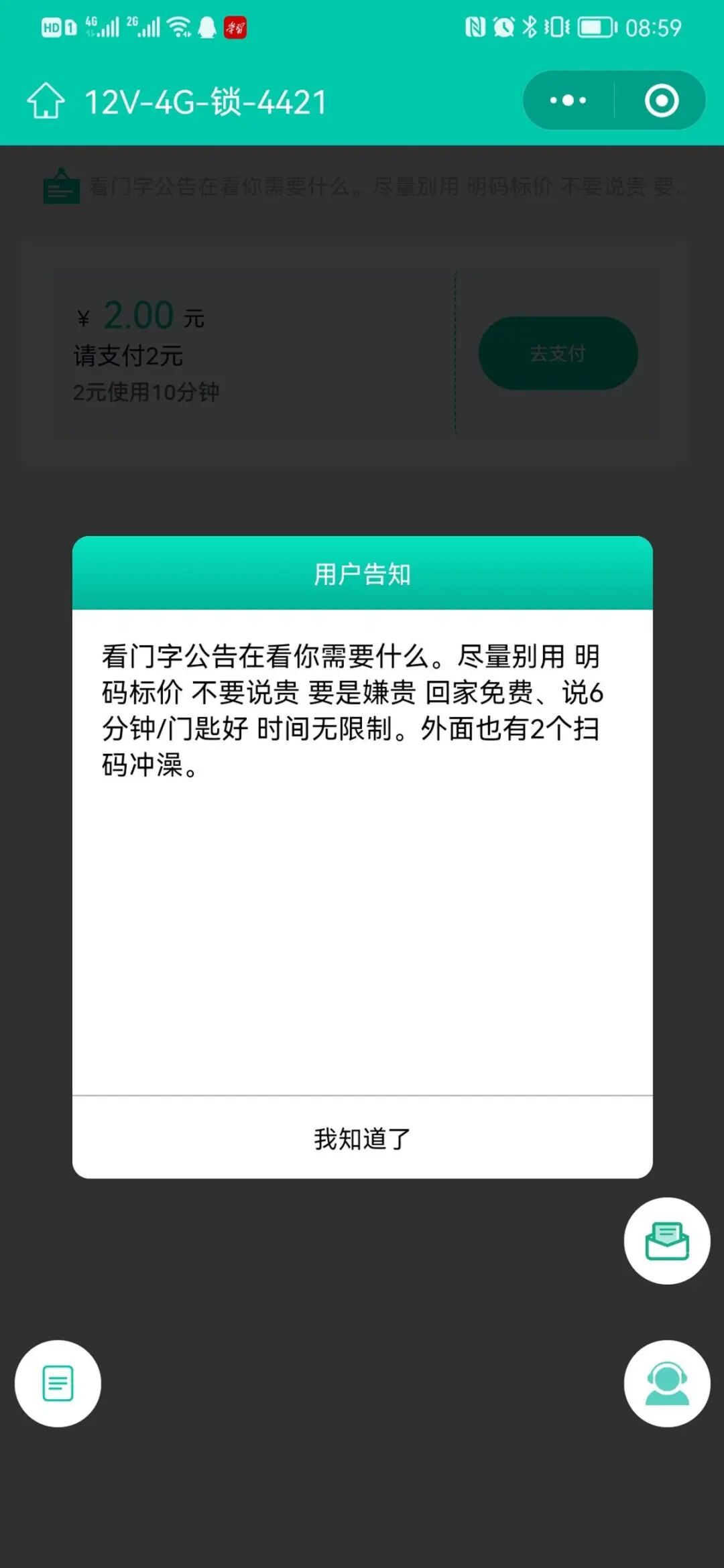 随后,极目新闻记者扫描了视频中厕所门上的二维码,扫描后弹出一则“用户告知”,告知称,“尽量别用,明码标价,不要说贵,要是嫌贵,回家免费,说6分钟,时间无限制。”进入页面后,支付价格已经变成2元。但在记者欲进行支付时,页面弹出提示:“设备不在线”。