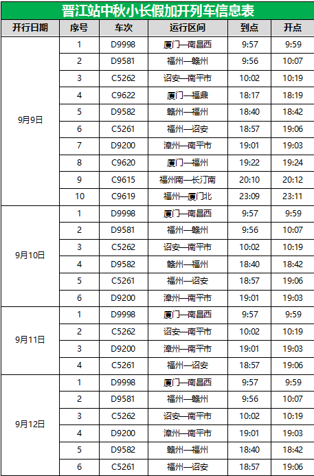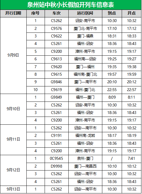 为方便旅客有更多的出行选择,“中秋”期间将加开多趟列车,多趟经停泉州站、晋江站,具体如下: