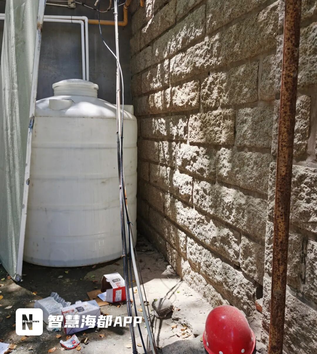 因为专用水管还没开通,之前使用小区里的井水被业主投诉过,所以喷淋设备确实没有一直开着。孙先生还带记者去看喷淋系统,记者看到,现场为喷淋系统供水的是一个水桶,里面的水几乎见底,