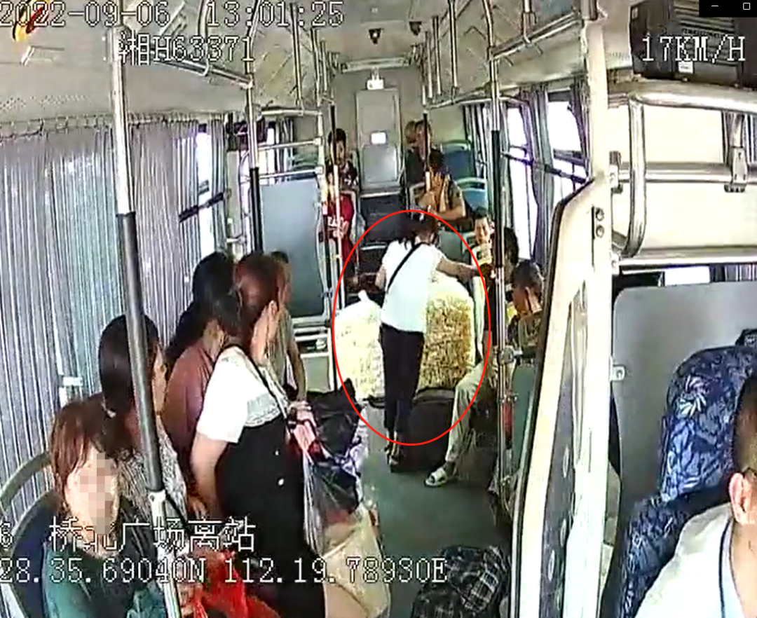 监控视频显示,9月6日13时许,桥北广场进站停车,一名大妈从公交车后门上车,将两大包塑料袋装的膨化零食泡泡杆一起搬上车,乘客上车后公交车继续行驶。大妈将物品摆放好后,走到公交车前方刷卡。