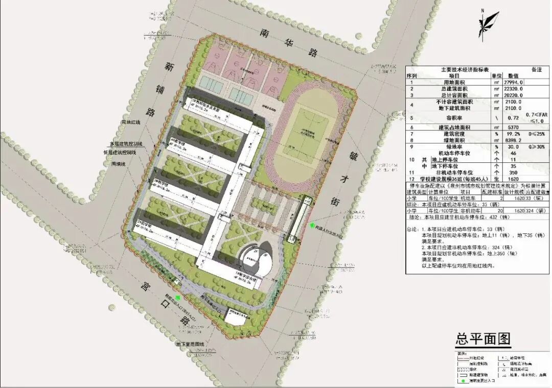 △泉州师范学院附属小学华大校区备案据了解,泉州师范学院附属小学华大校区项目位于编号A-06地块,范围北至南华路、西北至新铺路、西南至宫口路、东南至毓才街,主要技术指标为规划用地面积约27994㎡,总建筑面积约39192㎡。容积率≤1.2且≥0.7,建筑密度≤25%,绿地率≥35%,建筑限高≤30米。主要建设内容为36个教学班,包括教学楼、办公综合楼、门卫、大门、操场及绿化景观等附属配套设施。