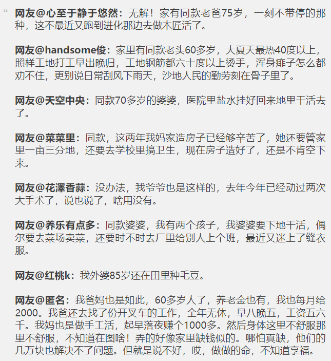 评论区不少网友表示,自己家也有同款——不管多大年纪,只要干得动,就没有闲下来的时候。也有网友抱怨,老人真的怎么劝都不听,有的甚至上午看病,下去就去干活了。