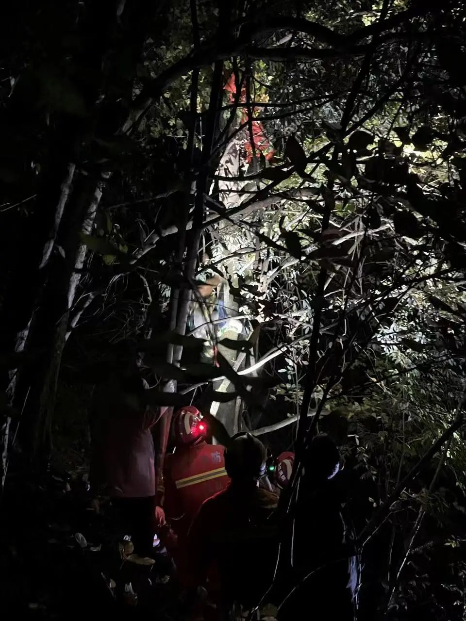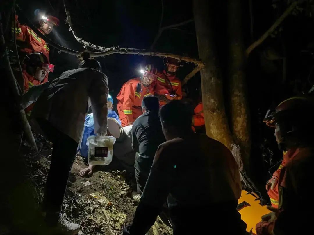 救援正式开始,2名消防队员带好护具上树接应,将绳子捆在被困人员身上,树下4人拉住绳索,一点一点将人放下来,10点07分,三人成功救下。由于山高路陡,且被困人员已出现昏迷症状,救援人员通过接力的方式,将三人安全运下山并送至医院诊疗,所幸均无生命危险。
