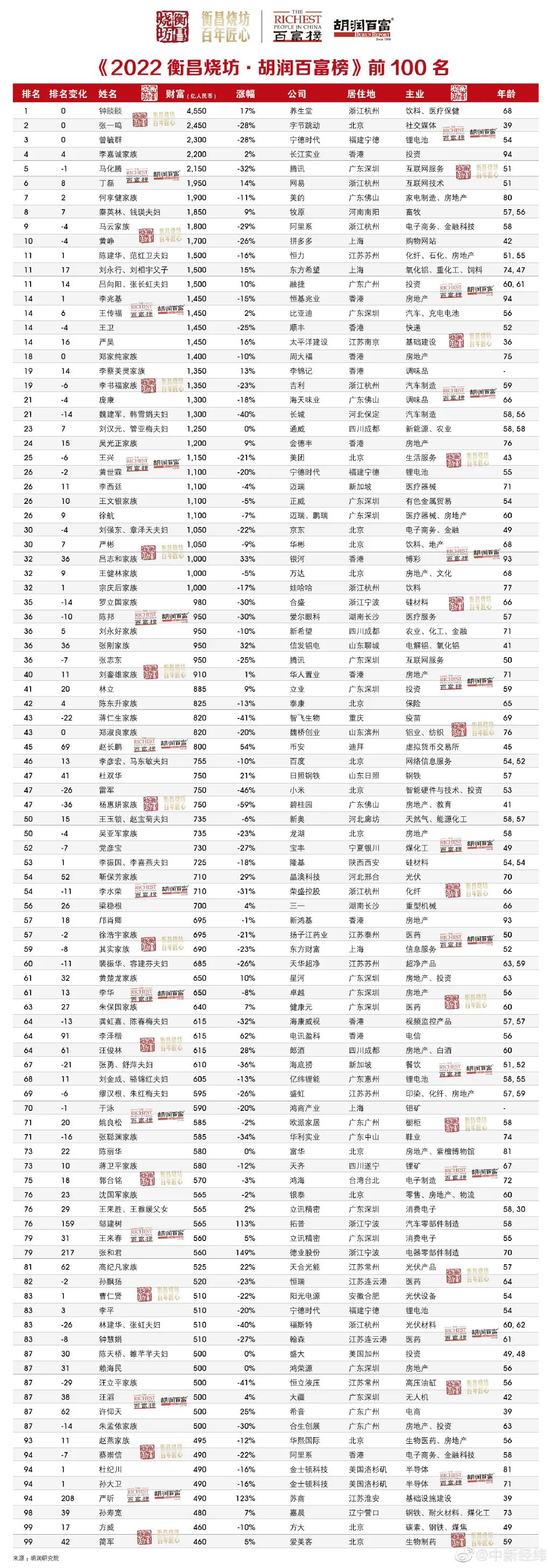 11月8日,胡润研究院发布《2022胡润百富榜》。农夫山泉68岁的浙商钟睒睒财富比去年增长650亿元,以4550亿元第二次成为中国首富。