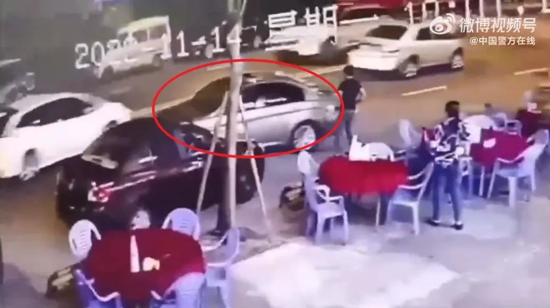 视频剪辑 *****一餐馆监控视频显示,11月14日晚7时许,一男一女在路边同桌就餐。用餐结束,男女起身快步钻进停在路边的轿车内,启动车辆。 餐馆工作人员发现情况不对后急忙跑到车前,拍打车窗提醒,但男子依旧驾驶车辆逆行驶离,工作人员在车后追赶但未能追上。