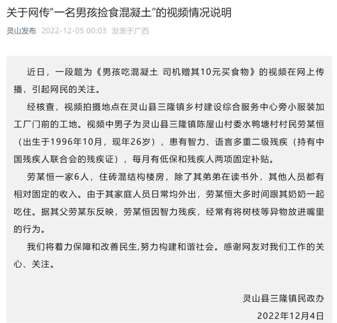 男孩蹲在地上抓混凝土吃,过路司机出于同情,给了其10元买食物,近日,这样一个视频引起网民关注。 12月5日凌晨,广西钦州灵山县通报,视频中“男孩”其实是一名智力和语言残疾的26岁男子,常有将异物放进嘴里的行为。