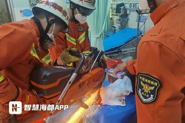 见此,消防员先是让医生利用纱布将男子手臂包裹好,防止破拆时造成二次伤害,随后将钻头模块固定住,防止打滑,并在利用无齿锯对准钻头根部进行剪切的同时,安排其余消防员用清水对剪切部位进行浇水冷却,防止高温烫伤。经过十几分钟的紧张处置,男子手指得以“脱困”。