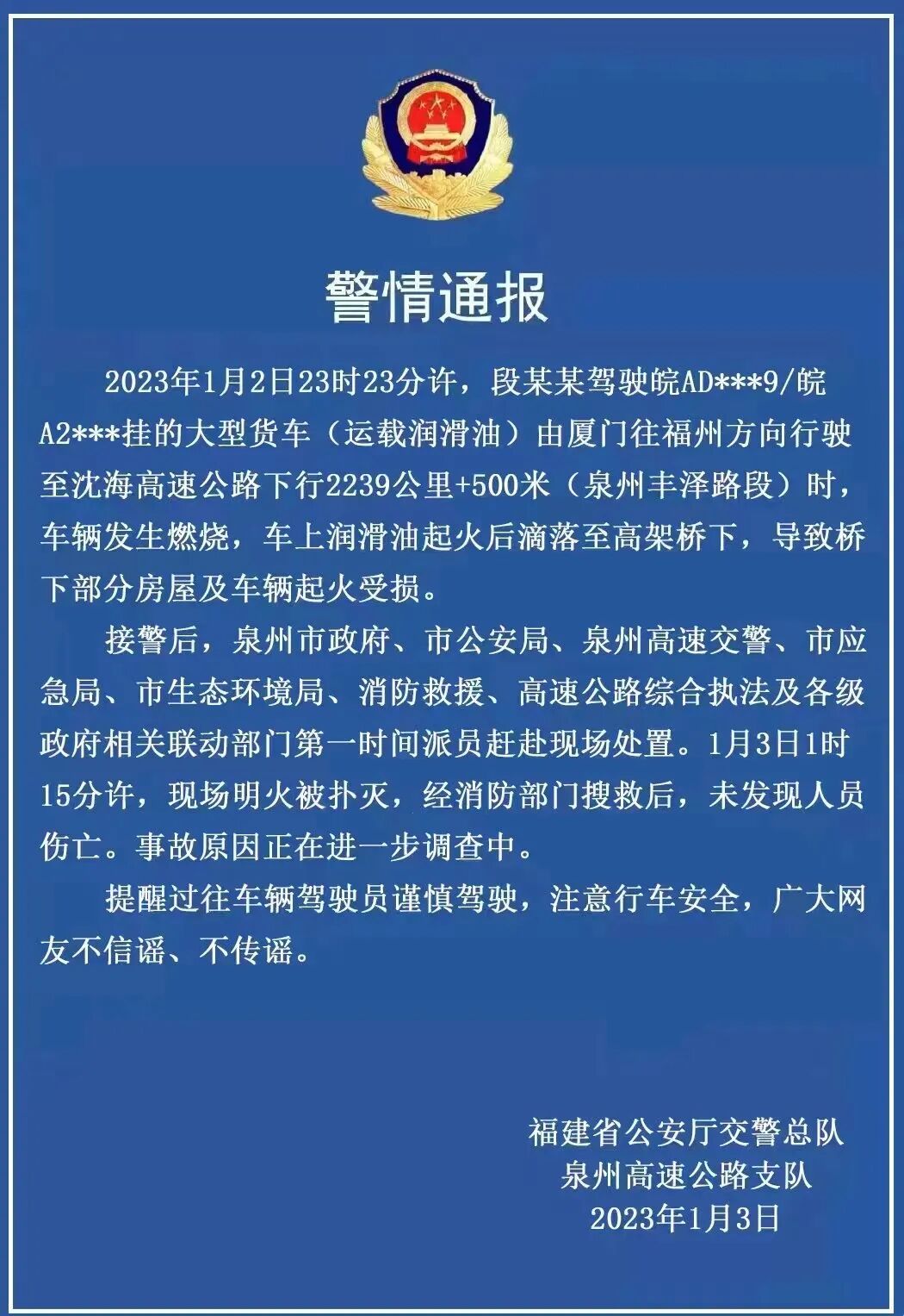 2023Äê1ÔÂ2ÈÕ23ʱ23·ÖÐí£¬¶Îijij¼ÝÊ»ÍîAD***9/Íî A2***¹ÒµÄ´óÐÍ»õ³µ(ÔËÔØÈó»¬ÓÍ)ÓÉÏÃÃÅÍù¸£ÖÝ·½ÏòÐÐÊ»ÖÁÉòº£¸ßËÙ¹«Â·ÏÂÐÐ2239¹«Àï+500Ã×(ȪÖÝ·áÔó·¶Î)ʱ£¬³µÁ¾·¢ÉúȼÉÕ£¬³µÉÏÈó»¬ÓÍÆð»ðºóµÎÂäÖÁ¸ß¼ÜÇÅÏ£¬µ¼ÖÂÇÅϲ¿·Ö·¿Îݼ°³µÁ¾Æð»ðÊÜËð¡£