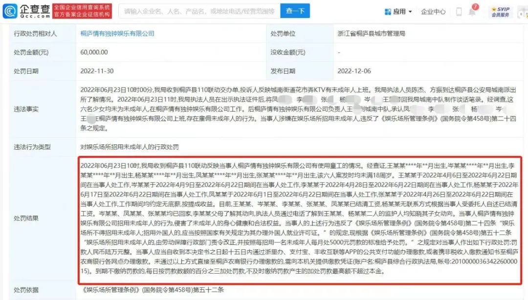 某查查APP显示,近日,浙江杭州,桐庐情有独钟娱乐有限公司因违反《娱乐场所管理条例》(国务院令第458号)第五十二条,被浙江省桐庐县城市管理局罚款6万元。 处罚事由显示,经查,当事人在2022年4月-6月期间,聘用凤某某、李某某、张某等六名未成年少女工作,工作期间均约定无底薪,按提成收益。当事人桐庐情有独钟娱乐有限公司招用未成年人的行为,侵害了未成年人的身心健康和合法权益。 根据《娱乐场所管理条例》(国务院令第458号)第五十二条“娱乐场所招用未成年人的,由劳动保障行政部门责令改正,并按照每招用一名未成年人每月处5000元罚款的标准给予处罚。”之规定对当事人罚款人民币陆万元整。 河南益仟律师事务所陈浩杰:我国未成年人保护法明确规定,经营性歌舞娱乐场所、酒吧、互联网上网服务经营场所等不适宜未成年人活动场所的经营者,不得允许未成年人进入,而且经营者应当在显著位置设置未成年人禁入、限入的标志。所以说对于那种娱乐场所招用未成年人的,依据娱乐场所管理条例,由劳动保障部门责令改正,并且按照每招用一名未成年每月处5000元罚款的标准给予相应处罚。而且依据我国劳动法相关规定,我国实行最低工资保障制度,这种约定无底薪的工作方式严重侵害了劳动者的合法权益,也是对未成年人身心健康和合法权益的侵害。来源:点时新闻、九派新闻、企查查官网