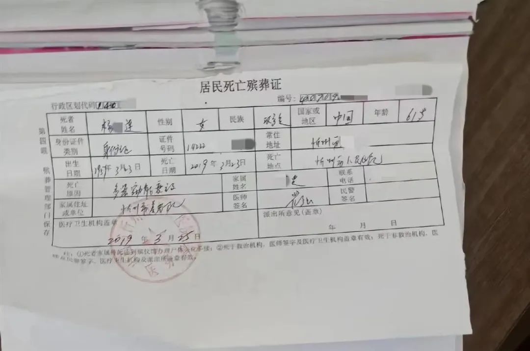 死亡证明显示,杨某连已于2019年离世(视频截图)