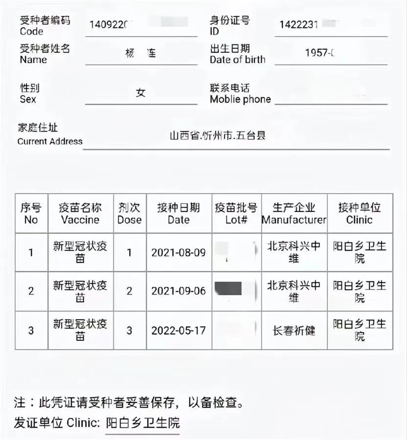 新型冠状病毒疫苗共接种三针,分别在2021年8月、2021年9月、2022年5月接种,接种单位均为阳白乡卫生院。