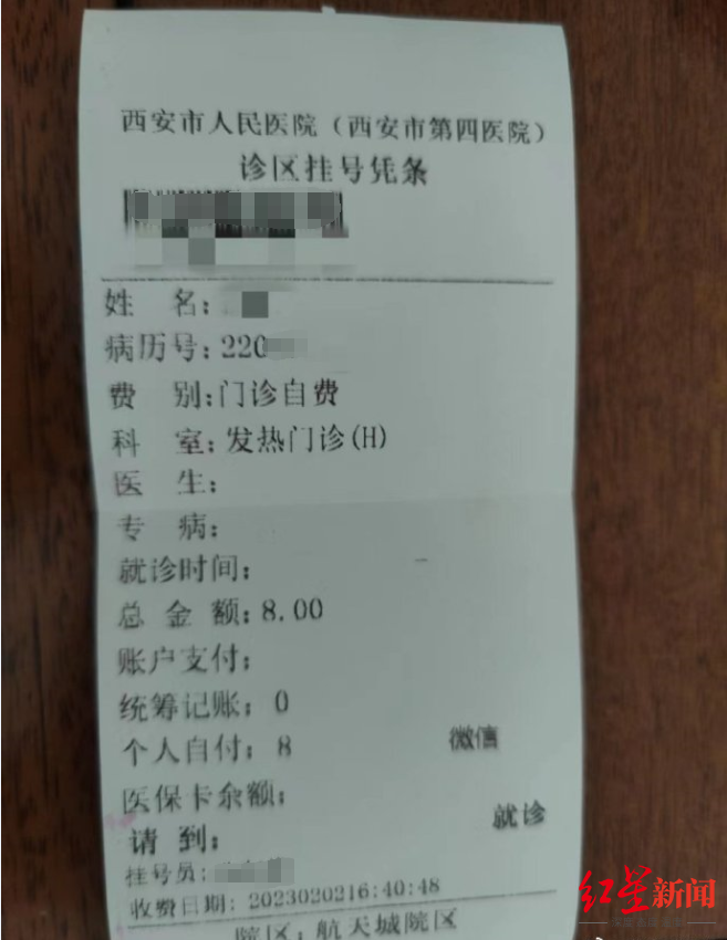 ↑挂号凭条2月3日,红星新闻记者联系上爆料网友王先生,他告诉记者,自己因需要,前往西安第四医院进行核酸检测。在医院门诊大厅被告知做核酸检测要先去发热门诊挂号。医护人员告诉王先生,发热门诊前台要交8块钱挂号费,拿着挂号费的票去找医生,会给开一个核酸检测的单子。王先生对医院的做法表示质疑。 2月3日,红星新闻记者电话联系西安市*****(西安市第四医院)航天城院区发热门诊,工作人员告诉记者,当天已经取消核酸检测挂号收费,“今早医务科来和我们说,‘0元通道’已经开通,核酸挂号免费了。” 关于“0元通道”,发热门诊工作人员向记者解释称,这是医院专门为核酸检测开通的挂号免费通道,因为有阳性的病人要上报,所以仍要挂号走流程。“0元通道不收费,但是要挂号。”