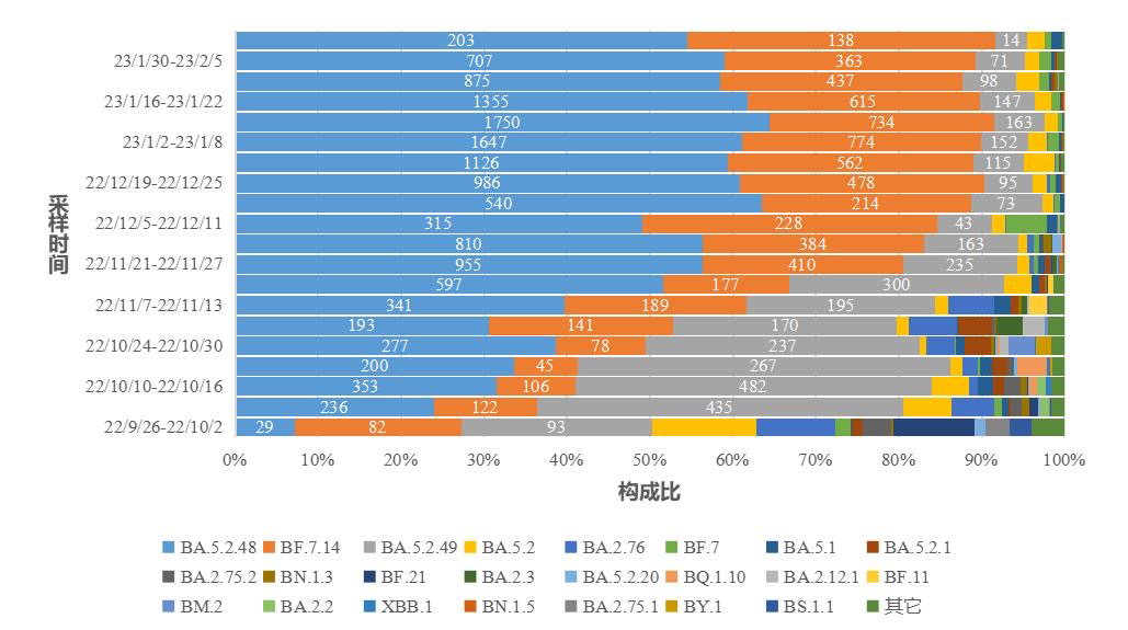 2.图中标记的数字分别为BA.5.2.48、BF.7.14和BA.5.2.49进化分支有效基因组序列数量。